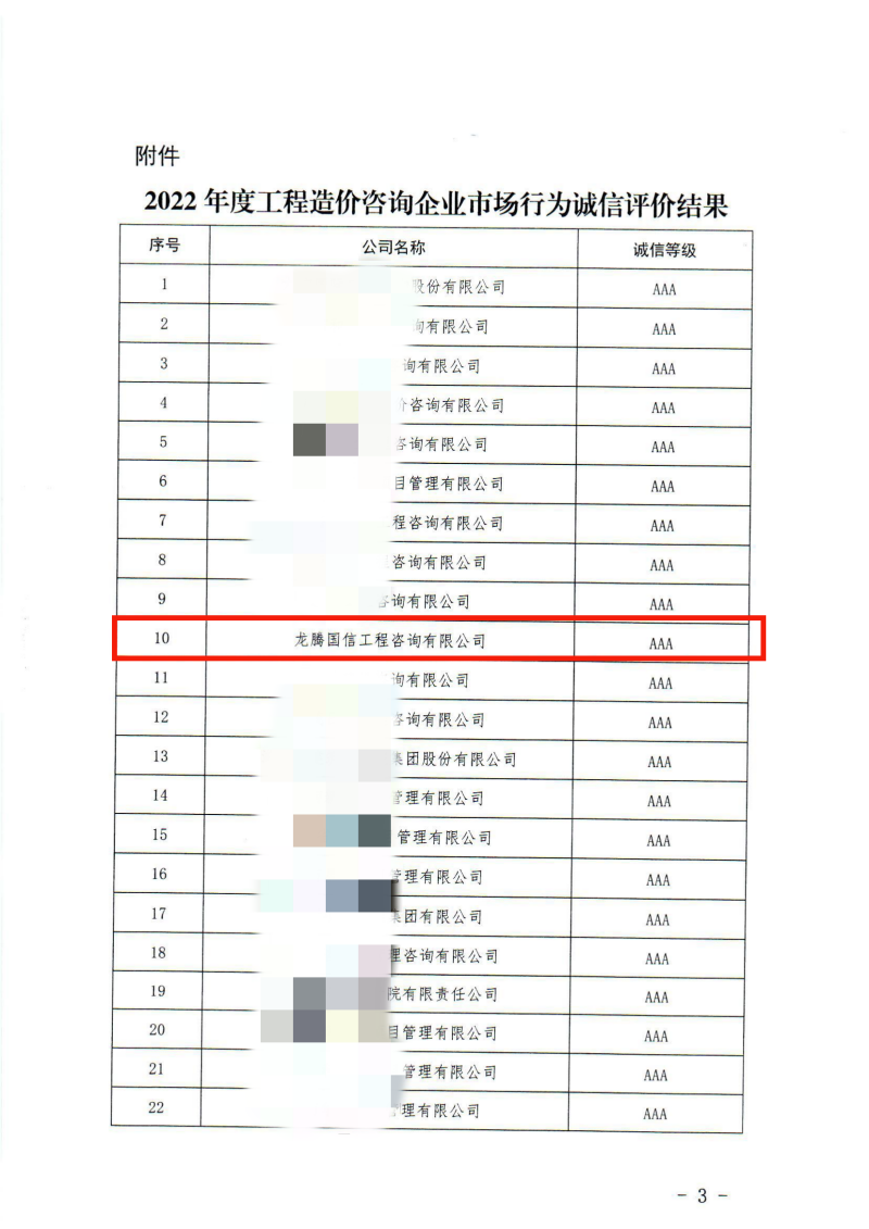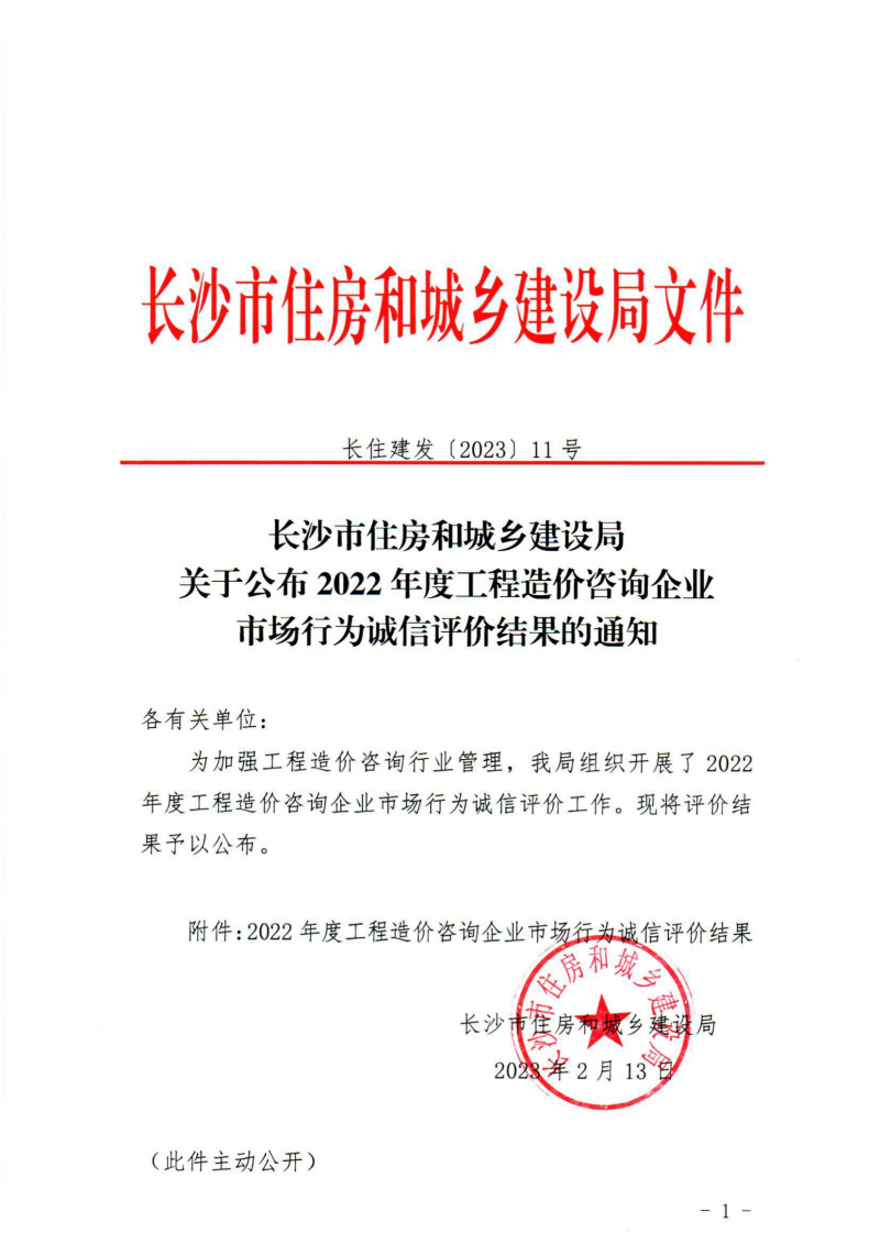 近日,長沙市住房和城鄉(xiāng)建設局為加強工程造價咨詢行業(yè)管理,組織開展了2022年度工程造價咨詢企業(yè)市場行為誠信評價工作,我單位獲評“2022年度工程造價咨詢企業(yè)信用等級AAA”。