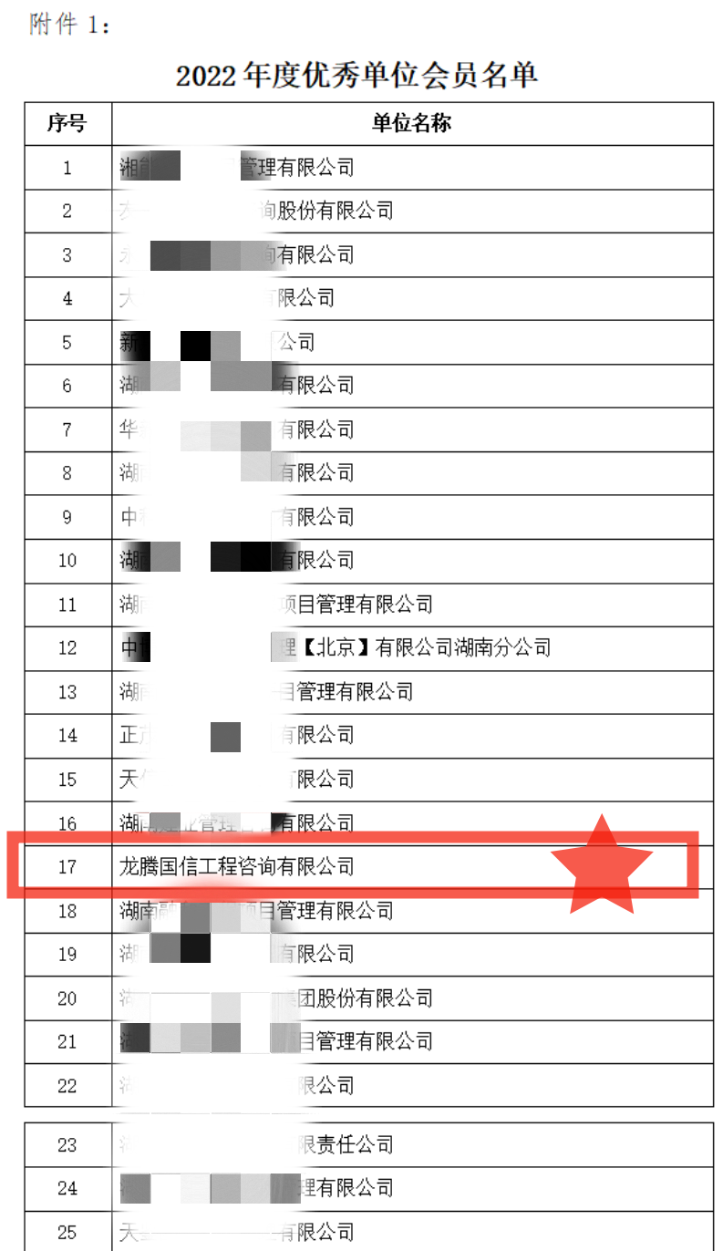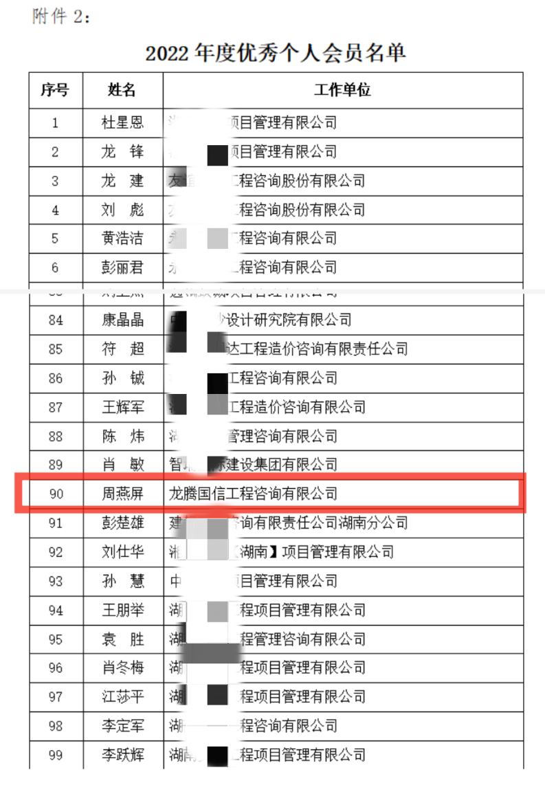 2022年,湖南省建設(shè)工程造價管理協(xié)會會員堅持以習(xí)近平新時代中國特色社會主義思想為指導(dǎo),全面貫徹黨的二十大精神,以實干擔當?shù)木瘛⒐钥穗y的韌勁,推動各項工作取得實效,保持了高質(zhì)量發(fā)展的良好勢頭,涌現(xiàn)出一大批優(yōu)秀會員單位和優(yōu)秀個人會員。為鼓勵先進,樹立典型,充分調(diào)動會員的積極性和創(chuàng)造性,根據(jù)《湖南省建設(shè)工程造價管理協(xié)會關(guān)于開展2022年度評選優(yōu)秀會員活動的通知》(湘建價協(xié)【2023】10號)要求,經(jīng)會員申報、評審小組評審、集體研究、結(jié)果公示,“龍騰國信工程咨詢有限公司”榮獲湖南省建設(shè)工程造價管理協(xié)會2022年度“優(yōu)秀單位”、公司造價工程師周燕屏獲“優(yōu)秀個人”榮譽稱號。