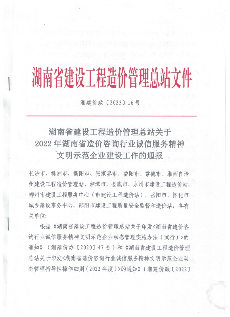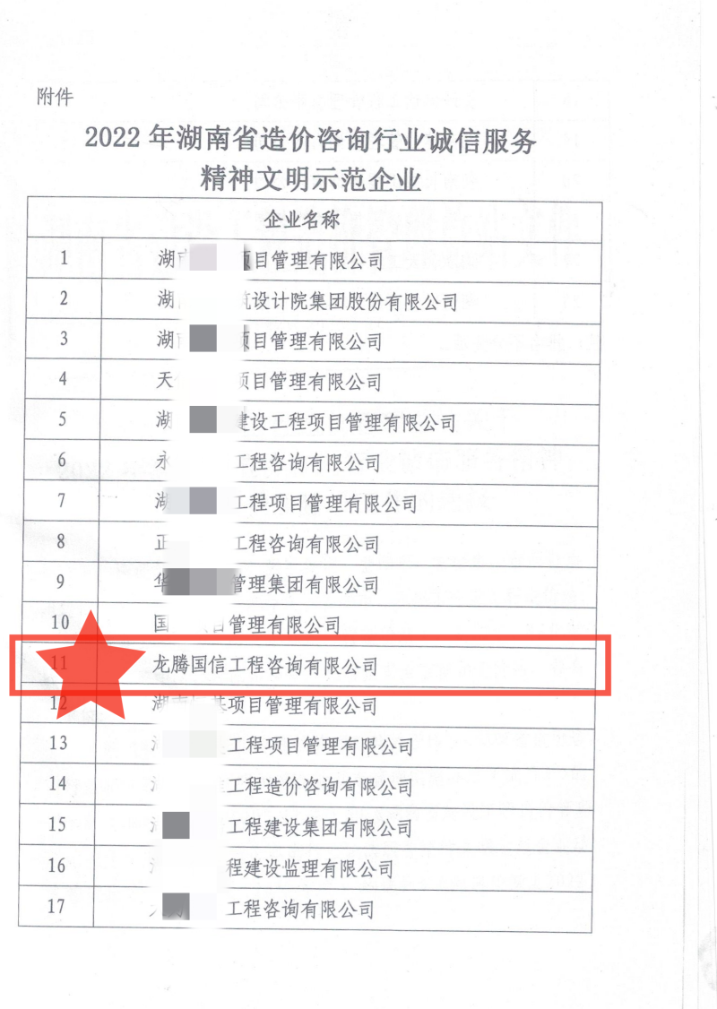 近日,龍騰國信工程咨詢有限公司被湖南省建設(shè)工程造價管理總站授予“2022屆湖南省造價咨詢行業(yè)誠信服務(wù)精神文明示范企業(yè)”。