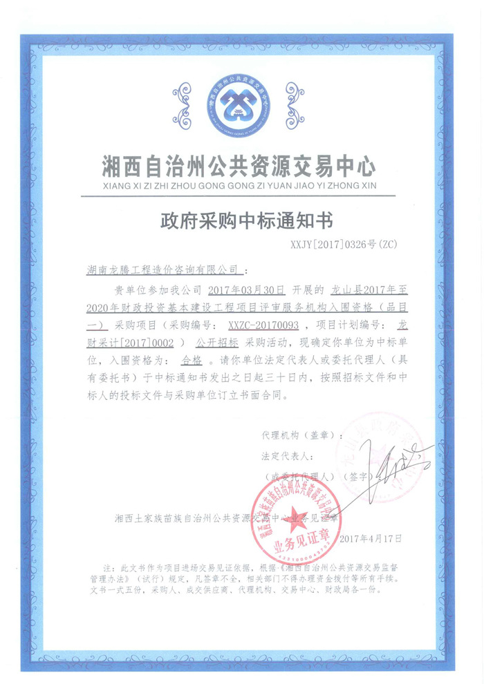 恭賀本公司入圍‘龍山縣2017年至2020年財(cái)政投資基本建設(shè)工程項(xiàng)目評(píng)審服務(wù)機(jī)構(gòu)庫